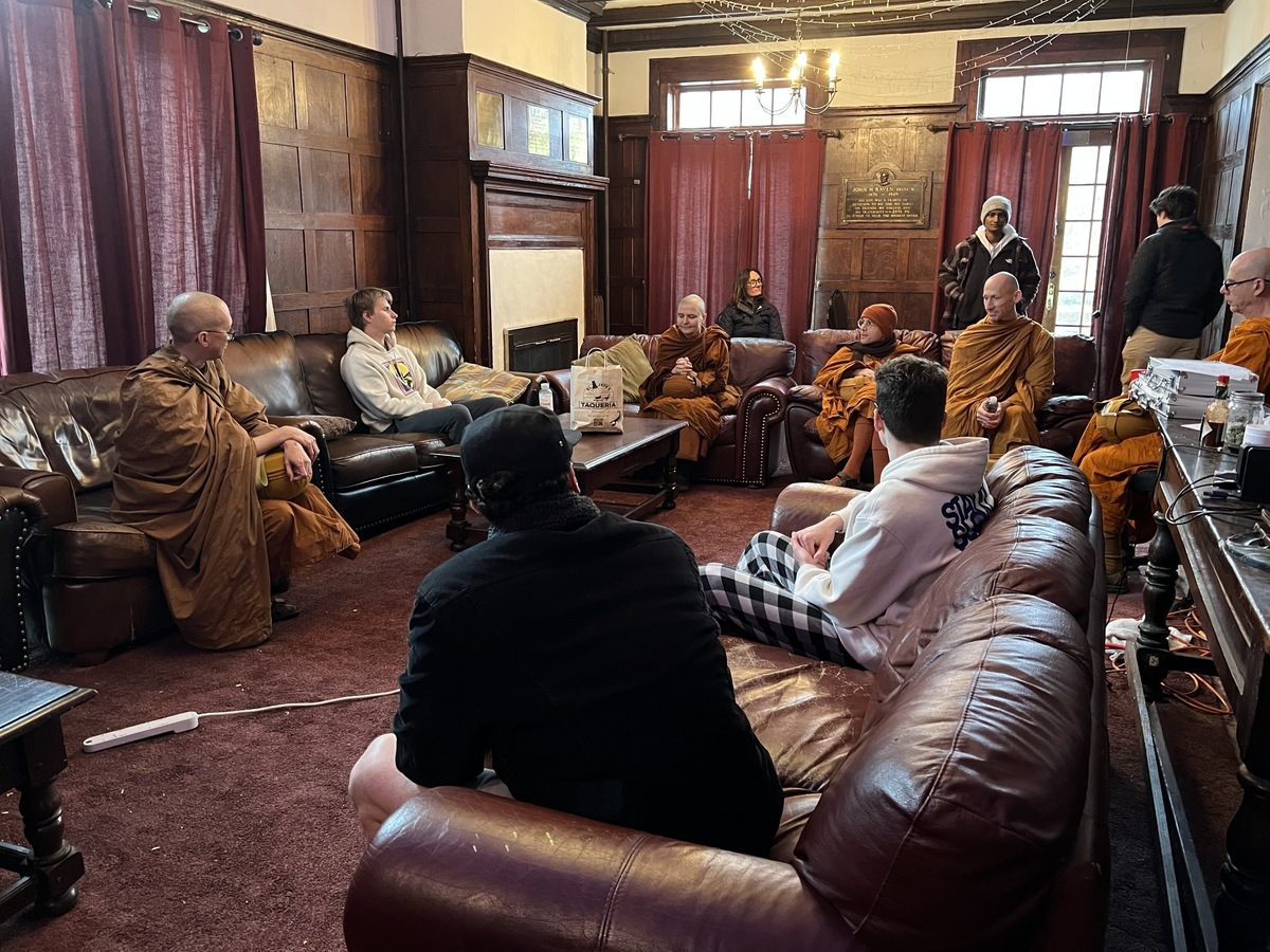 Monks from Empty Cloud Monastery visit a fraternity outside Rutgers University in New Brunswick, New Jersey where they were offered lunch.