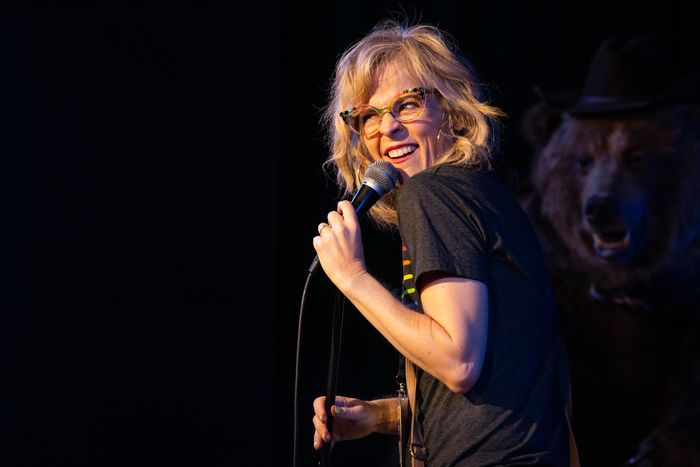 The reason for all this radical transparency is linked to the book’s theme. Bamford details the various “cults” that she has participated in over the years, which include four different 12-step programs (Overeaters Anonymous, Debtors Anonymous, Sex and Love Addicts Anonymous, and Recovering Couples Anonymous) as well as less official ones, like the cult of mental-health care and the cult of success. Via this tour of self-improvement modalities, we learn about the stages of Bamford’s career, her spectacular mental breakdown in 2010, what it took to make the Netflix TV show (Lady Dynamite) about her spectacular mental breakdown, and how one time she accidentally sort of killed her elderly pug, Blossom. It’s a lot to fit into 267 pages, but Bamford manages to keep it flowing. After I finished it, I was eager not just to meet her but to see her do new material live, which I did at the improbable hour of 10 a.m. in a packed room at the Brooklyn Comedy Collective’s satellite space in medium-deep Bushwick.